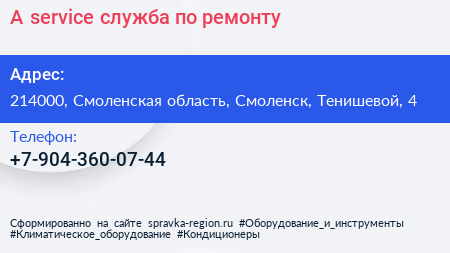 A-service, служба по ремонту по адресу 214000, Смоленская область, Смоленск, Тенишевой, 4 в дальнейшем Организация, размещена в следующих категориях: