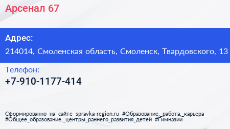 Арсенал 67 по адресу 214014, Смоленская область, Смоленск, Твардовского, 13 в дальнейшем Организация, размещена в следующих категориях: