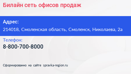 Билайн, сеть офисов продаж по адресу 214018, Смоленская область, Смоленск, Николаева, 2а в дальнейшем Организация, размещена в следующих категориях: