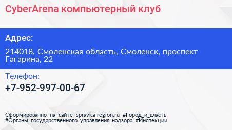 CyberArena, компьютерный клуб по адресу 214018, Смоленская область, Смоленск, проспект Гагарина, 22 в дальнейшем Организация, размещена в следующих категориях: