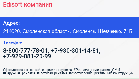 Edisoft, компания по адресу 214020, Смоленская область, Смоленск, Шевченко, 71Б в дальнейшем Организация, размещена в следующих категориях: