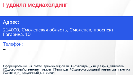 Гудвилл, медиахолдинг по адресу 214000, Смоленская область, Смоленск, проспект Гагарина, 10 в дальнейшем Организация, размещена в следующих категориях: