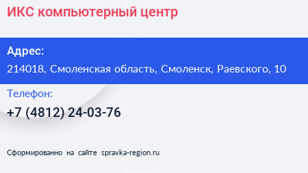 ИКС, компьютерный центр по адресу 214018, Смоленская область, Смоленск, Раевского, 10 в дальнейшем Организация, размещена в следующих категориях: