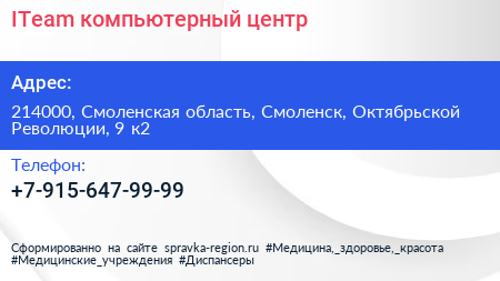 ITeam, компьютерный центр по адресу 214000, Смоленская область, Смоленск, Октябрьской Революции, 9 к2 в дальнейшем Организация, размещена в следующих категориях: