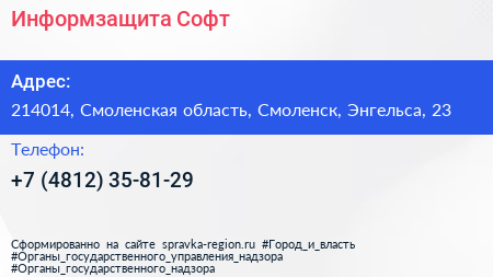 Информзащита-Софт по адресу 214014, Смоленская область, Смоленск, Энгельса, 23 в дальнейшем Организация, размещена в следующих категориях: