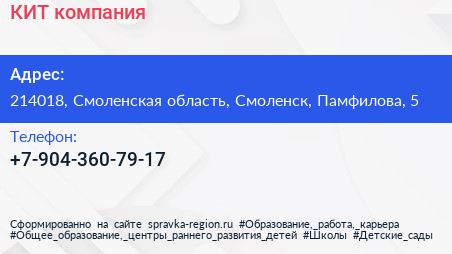 КИТ, компания по адресу 214018, Смоленская область, Смоленск, Памфилова, 5 в дальнейшем Организация, размещена в следующих категориях:
