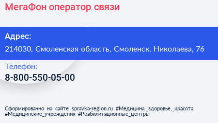 МегаФон, оператор связи по адресу 214030, Смоленская область, Смоленск, Николаева, 76 в дальнейшем Организация, размещена в следующих категориях: