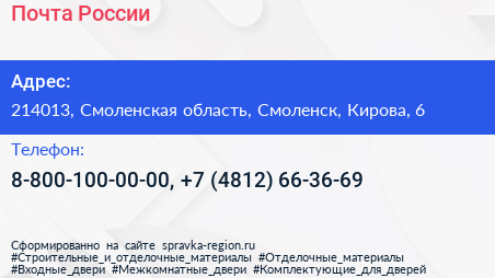 Почта России по адресу 214013, Смоленская область, Смоленск, Кирова, 6 в дальнейшем Организация, размещена в следующих категориях: