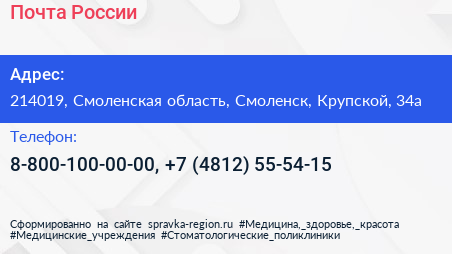 Почта России по адресу 214019, Смоленская область, Смоленск, Крупской, 34а в дальнейшем Организация, размещена в следующих категориях: