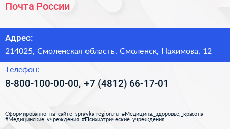 Почта России по адресу 214025, Смоленская область, Смоленск, Нахимова, 12 в дальнейшем Организация, размещена в следующих категориях: