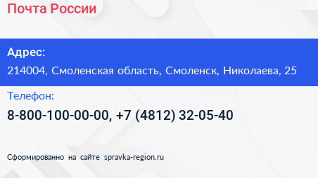 Почта России по адресу 214004, Смоленская область, Смоленск, Николаева, 25 в дальнейшем Организация, размещена в следующих категориях: