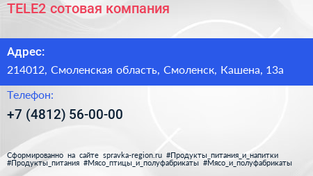 TELE2, сотовая компания по адресу 214012, Смоленская область, Смоленск, Кашена, 13а в дальнейшем Организация, размещена в следующих категориях: