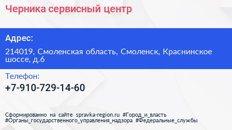 Черника, сервисный центр по адресу 214019, Смоленская область, Смоленск, Краснинское шоссе, д.6 в дальнейшем Организация, размещена в следующих категориях: