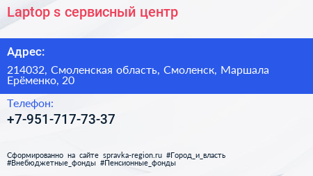Laptop`s, сервисный центр по адресу 214032, Смоленская область, Смоленск, Маршала Ерёменко, 20 в дальнейшем Организация, размещена в следующих категориях: