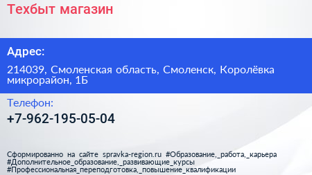 Техбыт, магазин по адресу 214039, Смоленская область, Смоленск, Королёвка микрорайон, 1Б в дальнейшем Организация, размещена в следующих категориях: