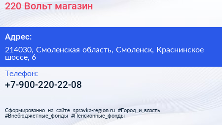 220 Вольт, магазин по адресу 214030, Смоленская область, Смоленск, Краснинское шоссе, 6 в дальнейшем Организация, размещена в следующих категориях: