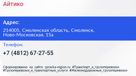 Айтико по адресу 214005, Смоленская область, Смоленск, Ново-Московская, 15а в дальнейшем Организация, размещена в следующих категориях: