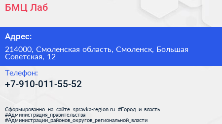 БМЦ Лаб по адресу 214000, Смоленская область, Смоленск, Большая Советская, 12 в дальнейшем Организация, размещена в следующих категориях: