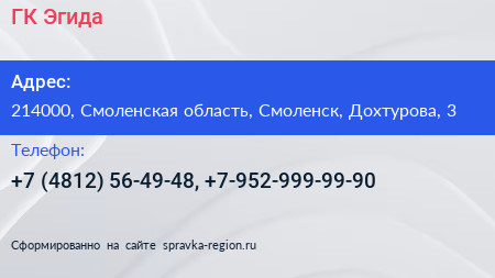 ГК Эгида по адресу 214000, Смоленская область, Смоленск, Дохтурова, 3 в дальнейшем Организация, размещена в следующих категориях: