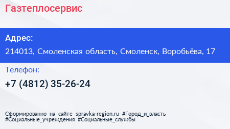 Газтеплосервис по адресу 214013, Смоленская область, Смоленск, Воробьёва, 17 в дальнейшем Организация, размещена в следующих категориях: