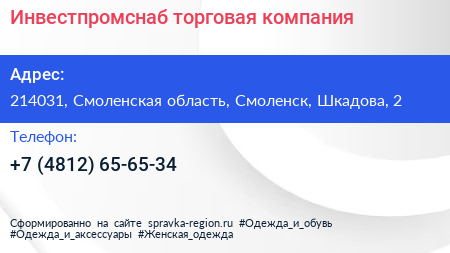 Инвестпромснаб, торговая компания по адресу 214031, Смоленская область, Смоленск, Шкадова, 2 в дальнейшем Организация, размещена в следующих категориях: