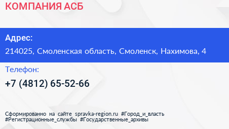 КОМПАНИЯ АСБ по адресу 214025, Смоленская область, Смоленск, Нахимова, 4 в дальнейшем Организация, размещена в следующих категориях: