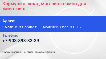 Кормушка, склад-магазин кормов для животных по адресу Смоленская область, Смоленск, Озёрная, 1Б в дальнейшем Организация, размещена в следующих категориях: