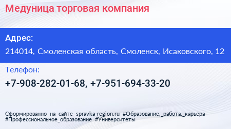 Медуница, торговая компания по адресу 214014, Смоленская область, Смоленск, Исаковского, 12 в дальнейшем Организация, размещена в следующих категориях:
