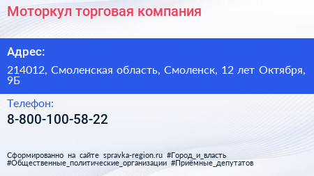 Моторкул, торговая компания по адресу 214012, Смоленская область, Смоленск, 12 лет Октября, 9Б в дальнейшем Организация, размещена в следующих категориях: