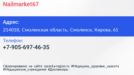 Nailmarket67 по адресу 214018, Смоленская область, Смоленск, Кирова, 61 в дальнейшем Организация, размещена в следующих категориях: