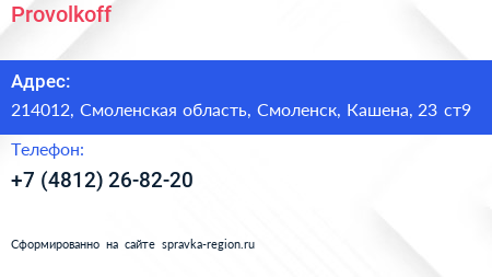 Provolkoff по адресу 214012, Смоленская область, Смоленск, Кашена, 23 ст9 в дальнейшем Организация, размещена в следующих категориях: