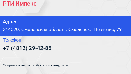 РТИ-Импекс по адресу 214020, Смоленская область, Смоленск, Шевченко, 79 в дальнейшем Организация, размещена в следующих категориях:
