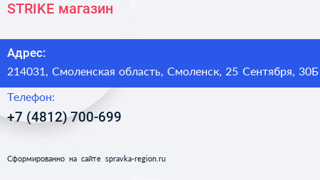 STRIKE, магазин по адресу 214031, Смоленская область, Смоленск, 25 Сентября, 30Б в дальнейшем Организация, размещена в следующих категориях:
