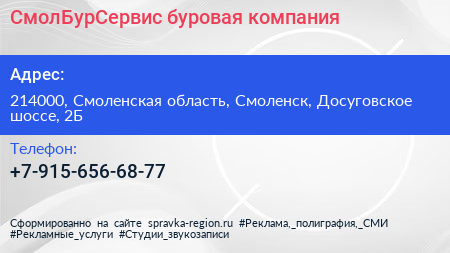 СмолБурСервис, буровая компания по адресу 214000, Смоленская область, Смоленск, Досуговское шоссе, 2Б в дальнейшем Организация, размещена в следующих категориях: