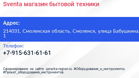 Sventa, магазин бытовой техники по адресу 214031, Смоленская область, Смоленск, улица Бабушкина, 1 в дальнейшем Организация, размещена в следующих категориях: