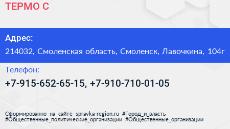 ТЕРМО-С по адресу 214032, Смоленская область, Смоленск, Лавочкина, 104г в дальнейшем Организация, размещена в следующих категориях: