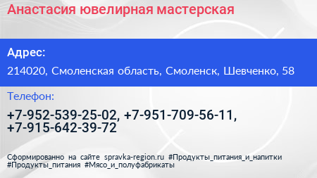 Анастасия, ювелирная мастерская по адресу 214020, Смоленская область, Смоленск, Шевченко, 58 в дальнейшем Организация, размещена в следующих категориях: