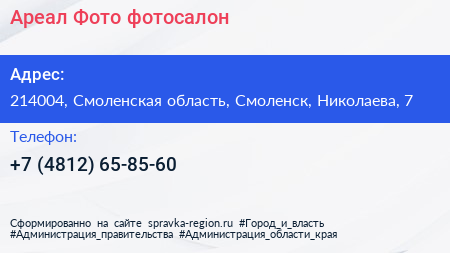 Ареал Фото, фотосалон по адресу 214004, Смоленская область, Смоленск, Николаева, 7 в дальнейшем Организация, размещена в следующих категориях: