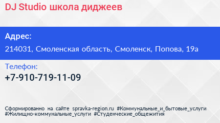 DJ Studio, школа диджеев по адресу 214031, Смоленская область, Смоленск, Попова, 19а в дальнейшем Организация, размещена в следующих категориях: