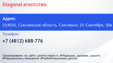 Diagonal, агентство по адресу 214031, Смоленская область, Смоленск, 25 Сентября, 30в в дальнейшем Организация, размещена в следующих категориях: