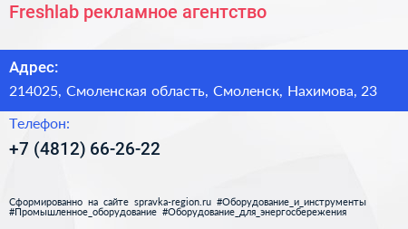 Freshlab, рекламное агентство по адресу 214025, Смоленская область, Смоленск, Нахимова, 23 в дальнейшем Организация, размещена в следующих категориях: