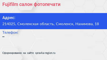 Fujifilm, салон фотопечати по адресу 214025, Смоленская область, Смоленск, Нахимова, 18 в дальнейшем Организация, размещена в следующих категориях: