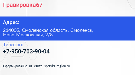 Гравировка67 по адресу 214005, Смоленская область, Смоленск, Ново-Московская, 2/8 в дальнейшем Организация, размещена в следующих категориях: