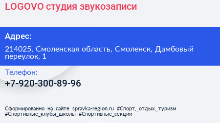 LOGOVO, студия звукозаписи по адресу 214025, Смоленская область, Смоленск, Дамбовый переулок, 1 в дальнейшем Организация, размещена в следующих категориях: