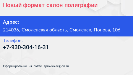 Новый формат, салон полиграфии по адресу 214036, Смоленская область, Смоленск, Попова, 106 в дальнейшем Организация, размещена в следующих категориях: