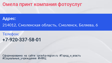 Омела принт, компания фотоуслуг по адресу 214012, Смоленская область, Смоленск, Беляева, 6 в дальнейшем Организация, размещена в следующих категориях: