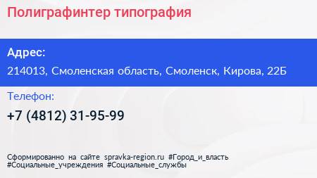 Полиграфинтер, типография по адресу 214013, Смоленская область, Смоленск, Кирова, 22Б в дальнейшем Организация, размещена в следующих категориях:
