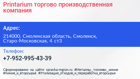 Printarium, торгово-производственная компания по адресу 214000, Смоленская область, Смоленск, Старо-Московская, 4 ст3 в дальнейшем Организация, размещена в следующих категориях: