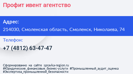 Профит, ивент-агентство по адресу 214030, Смоленская область, Смоленск, Николаева, 74 в дальнейшем Организация, размещена в следующих категориях: