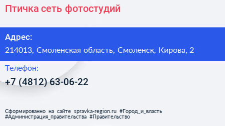 Птичка, сеть фотостудий по адресу 214013, Смоленская область, Смоленск, Кирова, 2 в дальнейшем Организация, размещена в следующих категориях: